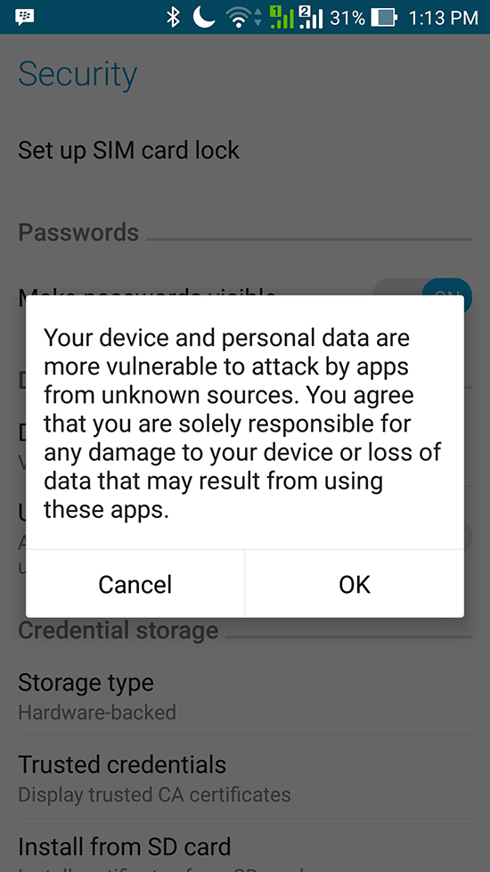 2. Jika sudah selesai, klik dan install langsung file Alexavegas.apk, jika muncul keterangan Install Blocked, Pilih dan Klik “Settings”, setelah itu pilih “ Unknown Source” di bagian “ Security”, Centang/Klik pada bagian seperti yang dilingkari pada gambar dibawah ini.